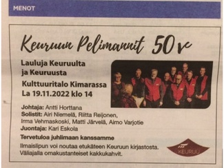 | KeuruunPelimannit20012019.pdf (466 kB) Vesistöjen ylistys Lumometsän tuvalla, mainos. |